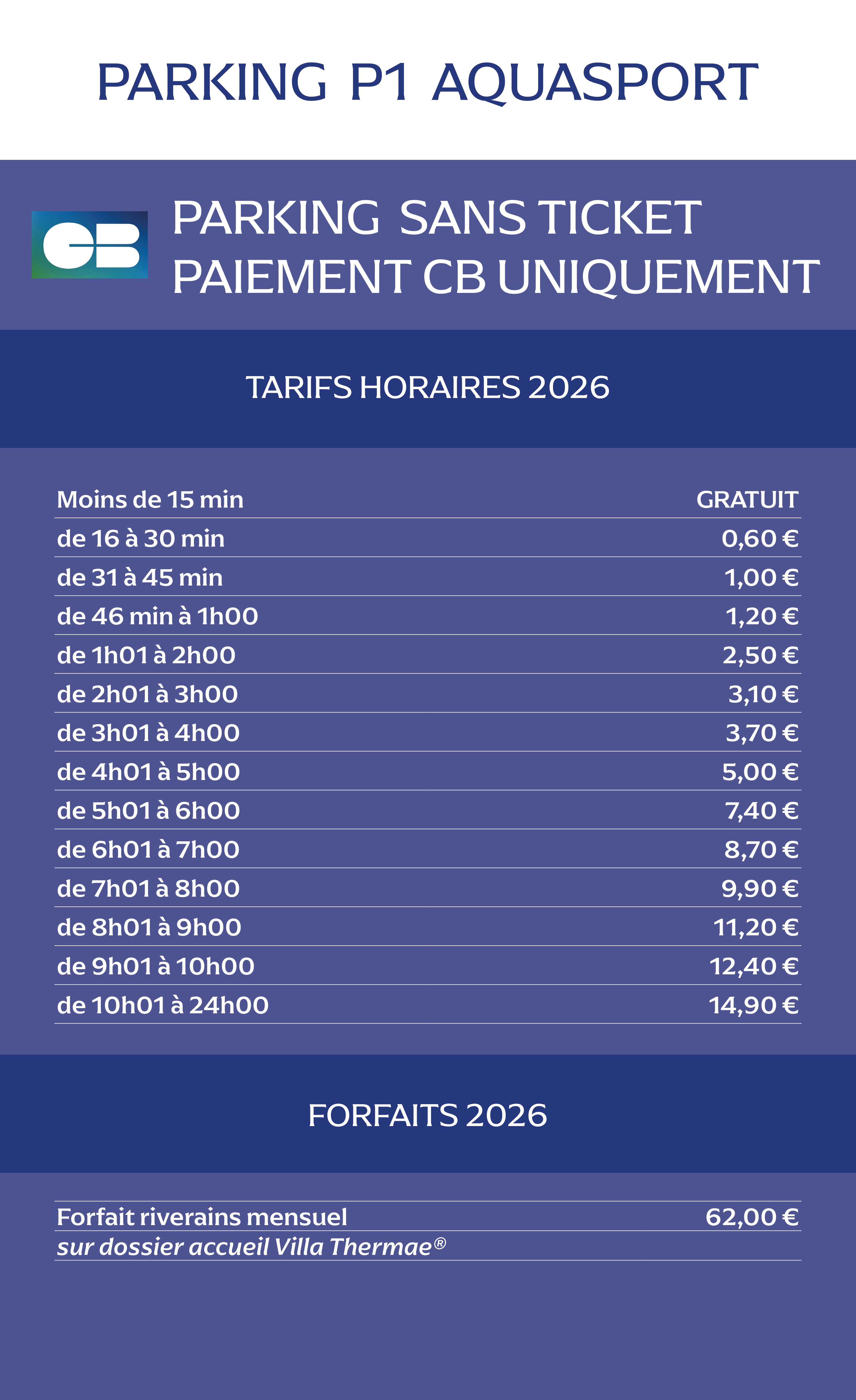 : le parking P2 souterrain est directement relié à la réception de l'hôtel. Pour stationner et accéder à l'Aquasport et au Spa Thermal, nous vous conseillons d'utiliser les autres parkings.