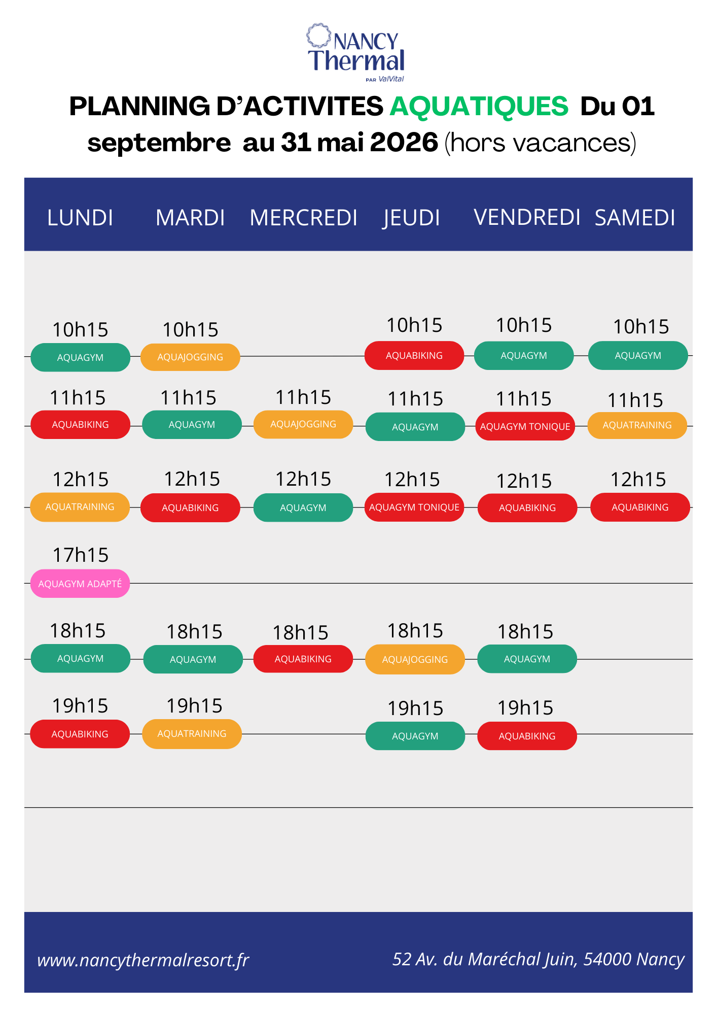 Le planning des activités Aquatiques